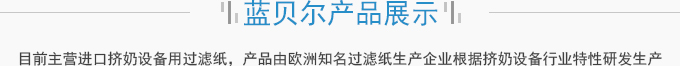 濟(jì)南藍(lán)貝爾工貿(mào)有限公司主要產(chǎn)品擠奶設(shè)備過(guò)濾紙,牛奶過(guò)濾紙,擠奶機(jī)過(guò)濾袋,目前主營(yíng)進(jìn)口擠奶設(shè)備用過(guò)濾紙,產(chǎn)品由歐洲知名過(guò)濾紙生產(chǎn)企業(yè)根據(jù)擠奶設(shè)備行業(yè)特性研發(fā)生產(chǎn),產(chǎn)品符合歐盟食品接觸標(biāo)準(zhǔn)及FDA食品接觸標(biāo)準(zhǔn),產(chǎn)品在擠奶設(shè)備過(guò)濾紙行業(yè)占有70%以上的份額。并通過(guò)了SGS標(biāo)準(zhǔn)技術(shù)檢測(cè)中心按國(guó)標(biāo)食品級(jí)標(biāo)準(zhǔn)進(jìn)行的檢測(cè)。產(chǎn)品適用于各種擠奶設(shè)備品牌,本公司目前獲得該區(qū)域產(chǎn)品營(yíng)銷資格。產(chǎn)品已用于國(guó)內(nèi)各大乳企所屬牧...